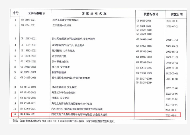 2021年5月7日,國標(biāo)標(biāo)準(zhǔn)化管理委員會印發(fā)了2021年第6號中國國家標(biāo)準(zhǔn)公告,強制性國家標(biāo)準(zhǔn)GB 40165-2021《固定式電子設(shè)備用鋰離子電池和電池組 安全技術(shù)規(guī)范》由國家市場監(jiān)督管理總局、國家標(biāo)準(zhǔn)化管理委員會批準(zhǔn)發(fā)布,該標(biāo)準(zhǔn)將于2022年5月1日起開始實施。
